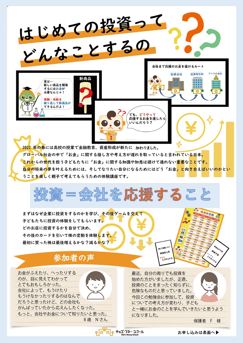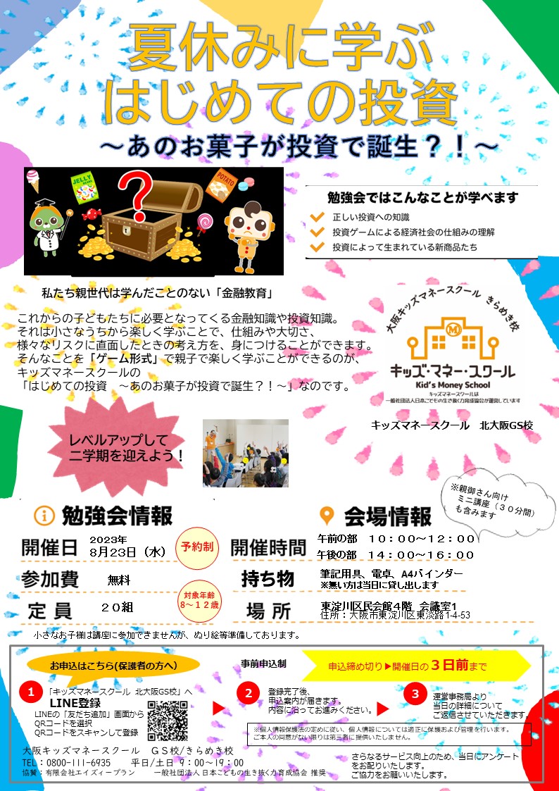 キッズマネースクール 夏休みに学ぶ はじめての投資 ~あのお菓子が投資で誕生?!~ 8月23日(水)に東淀川区民会館にて開催します(^^♪ ![]() これからの子どもたちに必要になってくる「金融知識」や「投資知識」が ゲーム形式で親子でたのしく学ぶことができる勉強会です! 8歳から参加できますので、親子でお金について楽しく学んでみませんか? ![]() この勉強会を通して、子ども達に「お金」というものに興味を持ってもらい、 少しでもマネー教育のお役に立つことができればと思っています。 開催詳細: 講師: キッズマネースクール きらめき校 登録講師 梶原 キッズマネースクール 大阪GS校 登録講師・ファイナンシャルプランナー資格保持者 場所: 東淀川区民会館4階 会議室1 大阪市東淀川区東淡路1-4-53 日程: 2023年 8月 23日(水) 10:00~12:00 14:00~16:00 対象者: 8~10歳までのお子様とその保護者の方 持ち物: 筆記用具・電卓・A4バインダー ※無い方は、当日に貸し出します お申し込みは、LINEまたはweb、お電話で! 公式サイトでもチェック |