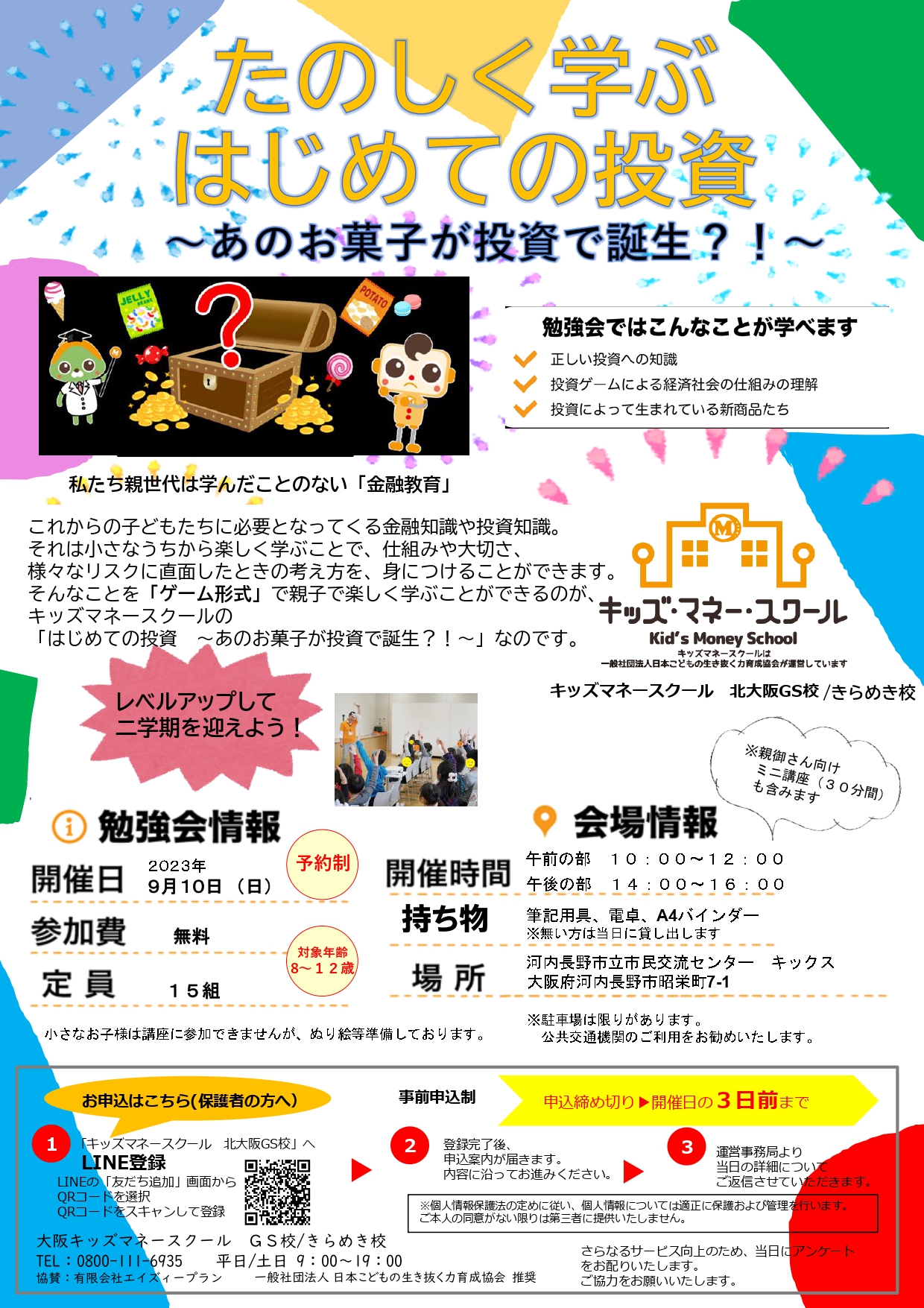 キッズマネースクール 夏休みに学ぶ はじめての投資 ~あのお菓子が投資で誕生?!~ 9月10日(日)に河内長野市立市民交流センター キックス にて開催します(^^♪ ![]() これからの子どもたちに必要になってくる「金融知識」や「投資知識」が ゲーム形式で親子でたのしく学ぶことができる勉強会です! 8歳から参加できますので、親子でお金について楽しく学んでみませんか? ![]() この勉強会を通して、子ども達に「お金」というものに興味を持ってもらい、 少しでもマネー教育のお役に立つことができればと思っています。 開催詳細: 講師: キッズマネースクール きらめき校 登録講師 梶原 キッズマネースクール 大阪GS校 登録講師・ファイナンシャルプランナー資格保持者 場所: 河内長野市立市民交流センター 大阪府河内長野市昭栄町7-1 日程: 2023年 9月 10日(日) 10:00~12:00 14:00~16:00 対象者: 8~10歳までのお子様とその保護者の方 持ち物: 筆記用具・電卓・A4バインダー ※無い方は、当日に貸し出します お申し込みは、LINEまたはweb、お電話で! 公式サイトでもチェック |